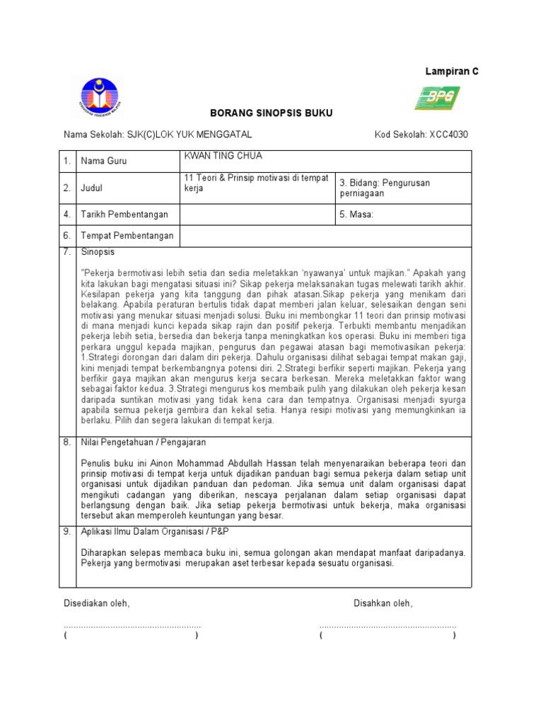 Guru Sebagai Pendorong Dalam Darjah. Hantarkan nama dan alamat. Lampiran C BORANG SINOPSIS BUKU Nama Sekolah.